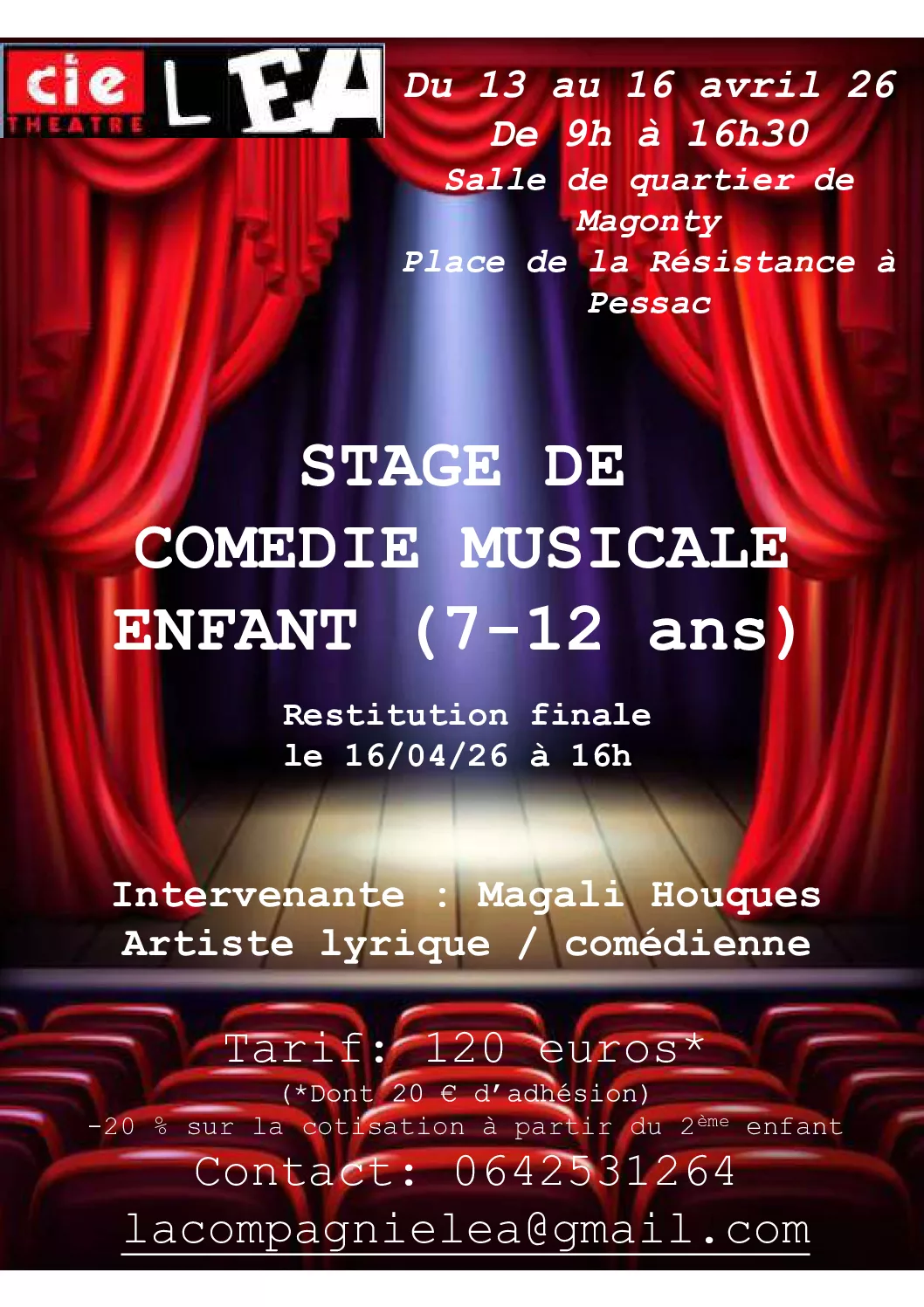 Ce stage est ouvert à tous les enfants de 7 à 12 ans (débutants ou initiés) et sera mené par Magali Houques (Comédienne / Artiste Lyrique)